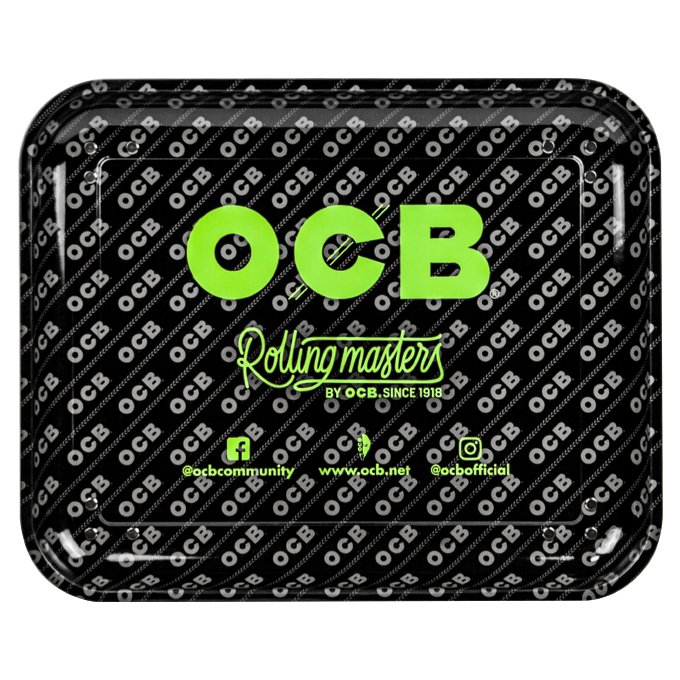 Bandeja OCB Grande Premium 44x35cm. Es una bandeja para armar metálica de gran tamaño. Viene con dos patas metálicas desplegables. Sus bordes son altos para que no se desperdicie nada al momento de armar tus cigarros. Es perfecta para tener tu kit completo en un solo lugar y para compartir el espacio amplio que la bandeja ofrece.